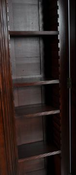 A 19th century rosewood and mahogany triple breakfront library bookcase cabinet. Raised on plinth base having a series of cupboards underneath a large double door glazed bookcase cabinet above flanked by sentry box bookcase cabinets either side. Flared cornice atop. Measures 223cms x 210cms x 44cms