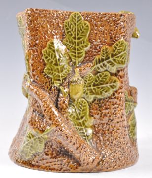 A late 19th / early 20th Century Rye Pottery naturalistic tree stump jug or tankard having a shaped body with branch handle. Decorated with relief leaves and acorns. Unsigned. Measures 14cm high. No visible damage.
