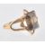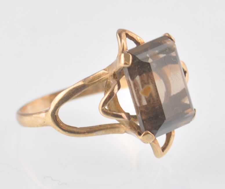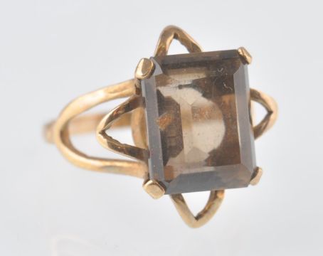 A mid century 9ct gold dress ring set with an emerald cut smokey quartz. Weight 3.3g.