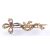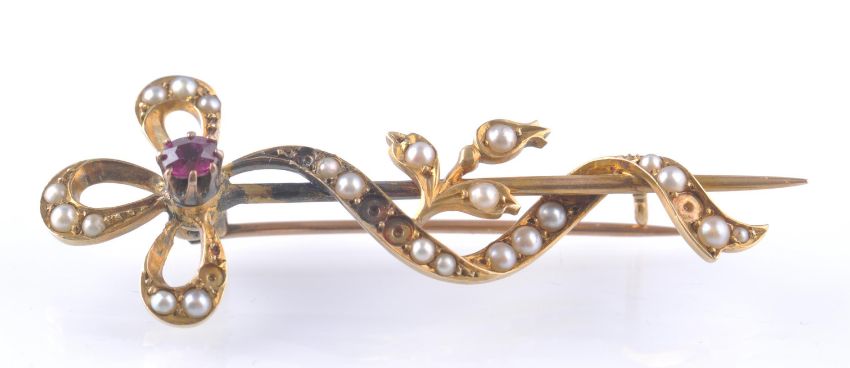 An 18ct gold ruby and seed pearl brooch - stick pin. The round cut ruby in claw setting with bow of seed pearls. Pin verso. Unmarked, tests as 18ct. Length 5.5cms / weight 5.46g