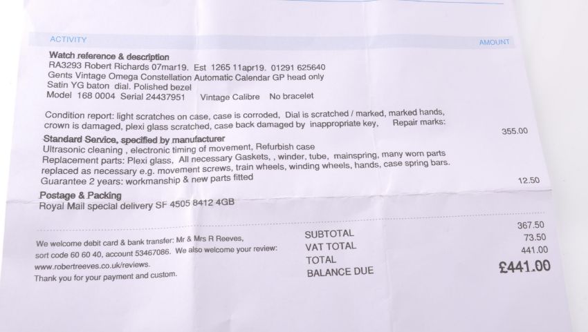 A good Omega Vintage Constellation Automatic Chronometer wristwatch model No 168 0004 / Serial 24437951. Complete in its leather presentation case along with a recent service receipt detailing works carried out by an accredited Omega service centre.