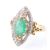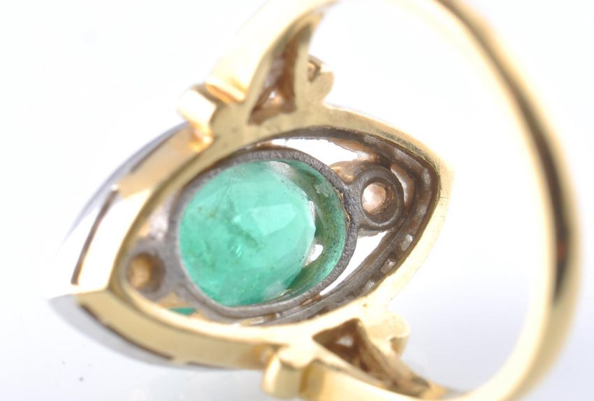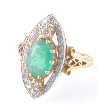 A hallmarked 18ct god emerald and diamond ring. The ring having a navette head set with a central oval mixed cut emerald flaked by two round brilliant cut diamonds and surrounded by a diamond halo. Estimated emerald weight 1.3 to 1.48ct. Estimated diamond weight 0.30ct. Total weight 6.4g. Size N.