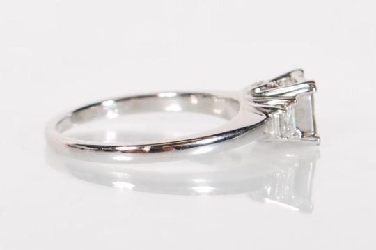An 18ct white gold pave set diamond ring. The central mount with 4 square cut diamonds flanked by recessed square cut diamond shoulders. Total weight 3.2g / Size J