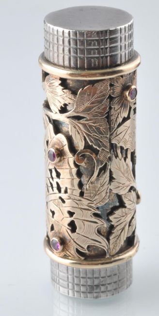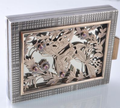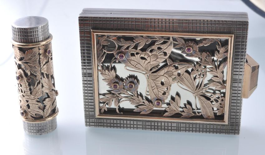 A 1940's Boucheron Paris gold and silver and ruby compact and lipstick suite. The suite by Boucheron consisting of a compact with pierced cover depicting butterflies amongst foliage, having bezel set mixed cut ruby accents with interior swivel mirror and powder compartments - remnants still within - housed within a chequer decorated case with geometric clip, signed Boucheron Paris and numbered Bt No 815012 and 79.552 with French assay marks. The lipstick holder with matching design signed Boucheron Paris and numbered Bt No 875012 with French assay marks for mixed metals both with the original cases. Weight:  Compact 176.5g, Lipstick holder 46. 7g. Measures; Compact 7.4 cms x 5.7cms. Lipstick holder 4.3cm.