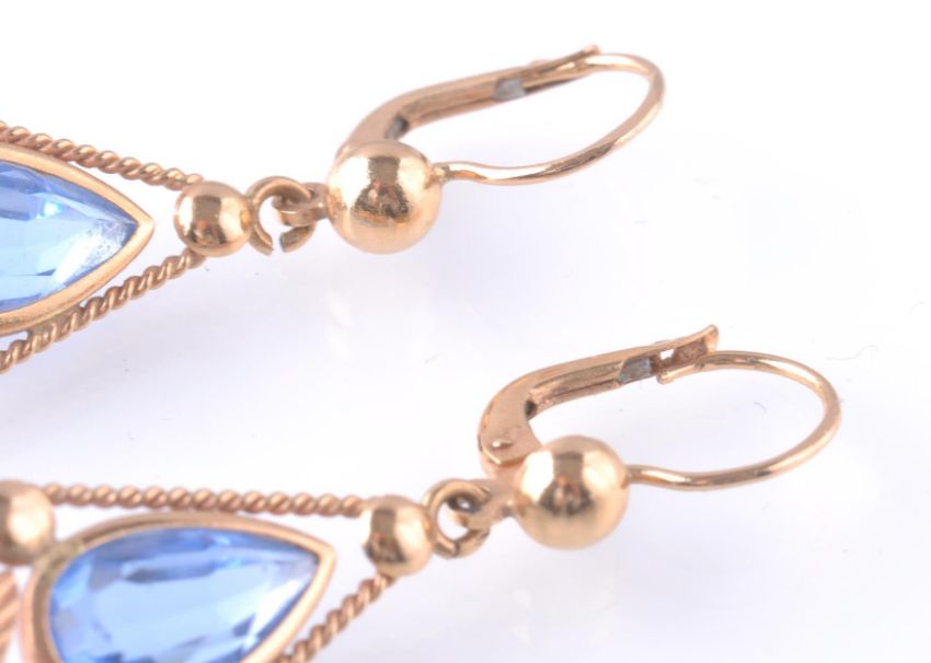 A pair of 19th century style 14ct gold drop earrings. The earrings set with a pear cut blue stone within a rope twist  border with diamond cut embellishments completed with a clip clasp. Measures 1 3/4 inch drop. Total weight 5.6g.