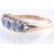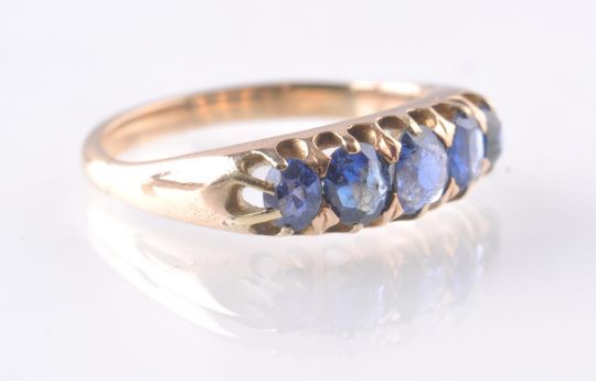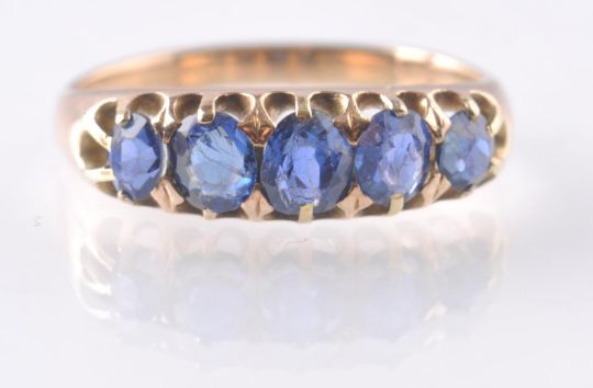 An unmarked 9ct gold five stone  dress ring set with five oval cut blue stones. Unmarked but tests as 9ct gold. Size N,