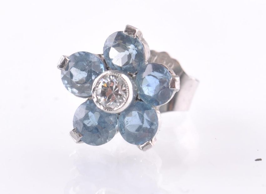 A pair of 18ct white gold, aquamarine and diamond cluster earrings. The earring set with a central brilliant cut diamond surrounded by 5 mixed cut aquamarine completed by post backs and butterfly fastener.  Total weight 3.2g. Measures approx 10mm diameter.