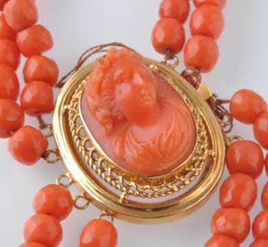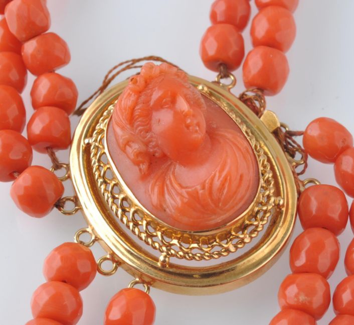 A 19th century French coral bead and cameo bracelet. The bracelet being strung with faceted coral beads, united by oval collet set cameo plaque, surrounded by filigree decoration and completed with hidden clip clasp. French eagle assay mark to clasp and cameo mount for 18 ct gold. Makers mark to clasp, AG within crossed swords. Measures 7 inches. Total weight 43.2g.