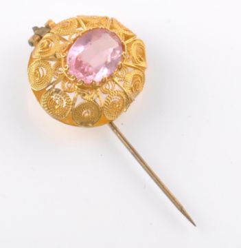 An 18ct gold filigree work and pink stone bracelet and matching pin. The bracelet having fine filigree work gold links set with large mixed cut pink stones. Measures approx bracelet 17cms, pin head 2cms. Weight bracelet 30.4g. Pin 3.8g. (The pin was made from a spare link to the bracelet when it was re-sized for the vendor by the jeweller)