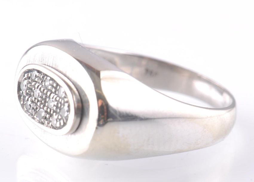 Contemporary 18ct white gold gentleman's ring with pave set diamond oval to centre. The diamonds approx est weight total 0.20pnts / Size Q