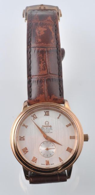 A modern Omega De Ville Co-Axial Chronometer gentleman's wristwatch. Stamped 86208565 having  silvered and gilt dial with sub dial, dagger hands all set to a leather and stainless steel strap heightened by gold plating.