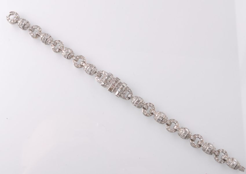 A French  Art Deco platinum and diamond bracelet. The bracelet set with round and baguette cut diamonds having chased geometric decoration to gallery of central lozenge. Completed with hidden spring hoop clasp. French assay mark for platinum. Measures approx 7 inches. Weight 22.5g.
