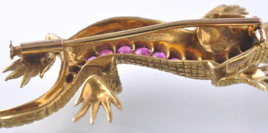 An early 20th century large 18ct gold ruby and sapphire salamander brooch.  The brooch being  formed in the manner of a salamander having channel set round mixed cut rubies to body with oval cut sapphire to head. The brooch being completed with trombone fastener. Total weight 15.3g. Measures 7.2cm