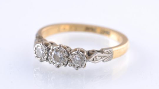An early 20th century 18ct gold, platinum, three stone diamond ring. The ring having three illusion set diamonds with steel cut decorated shoulders. Estimated diamond weight 0.20cts. Total weight 2.9g. Size K.