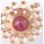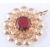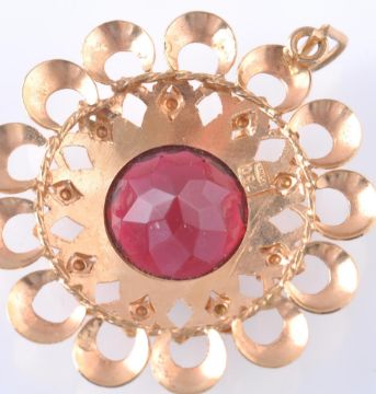 An 18ct gold and red gem set pendant. The pendant having openwork pierced setting with floral embellishments having a central large faceted round cut red stone. Stamped 750 151VA. Measures 1 &  3/4 inches. Total Weight 11.3g.