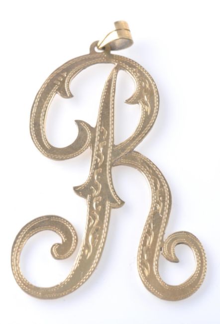 An oversized 14ct gold pendant in the form of the letter 'R'. The Pendant in the form of the letter R having chased foliate decoration with hoop bale.  Unmarked, tests 14ct gold. Measures 2 1/2 inches including bale. Weight 7.5g