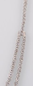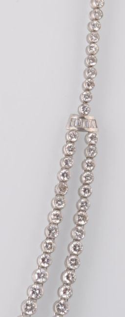 An Art Deco platinum and diamond single festoon necklace. The necklace being strung with 177 round brilliant and baguette cut diamonds. The baguette diamonds set within an arced fan spacer uniting the single and twinned strands. The necklace is completed by a clip clasp with safety catch. Tests platinum. Estimated diamond weight 22cts plus. Total weight 47.7g. Measures 17 inches.