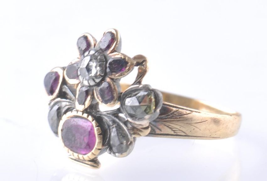 An antique Georgian 18th / 19th century ruby and diamond giardinetto ring set within cylinder box. Size N.5 / Weight 3.07g