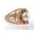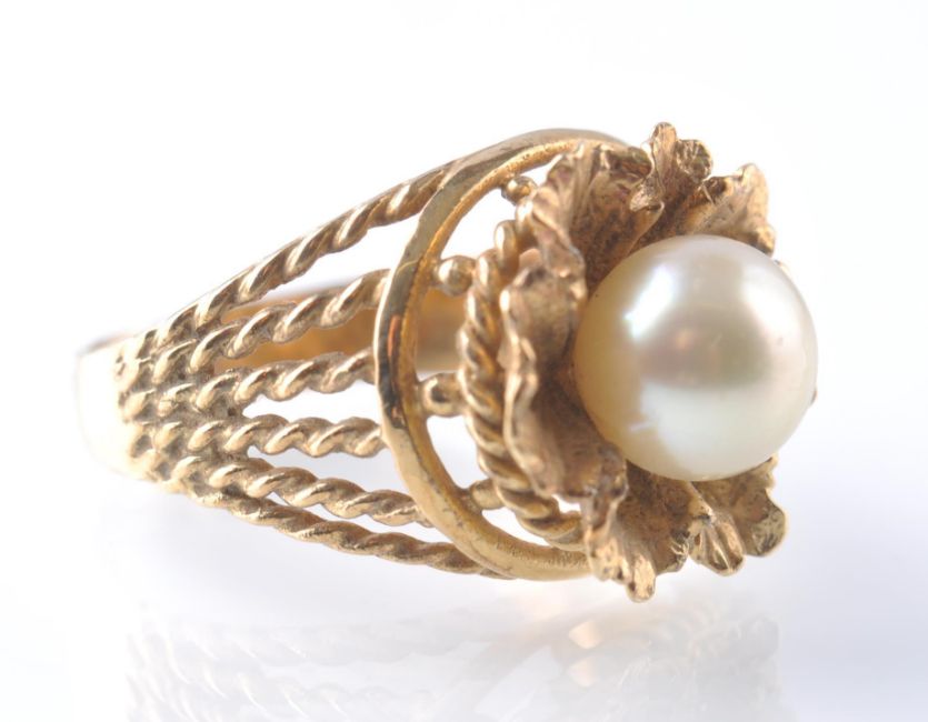 A 14ct gold and pearl ring. The ring being set with a single pearl in a flower setting having filigree decoration. Assay marks to outside of shank for 14ct gold. Weight 5.6g. Size N.