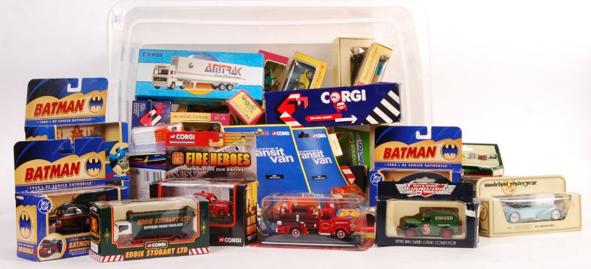 A collection of approximately 50x assorted diecast scale model vehicles by Matchbox, Corgi, Bburago / Burago, Lledo and Del Prado to include; Corgi 77313 The Vintage & Contemporary Edition Batmobiles, Vanguards 58009 1950 Morris Z Van Singer Sewing Machines, Corgi TY88407 Eddie Stobart Hauler, Del Prado Bedford 1939 and much more. All appear mint in their original boxes.