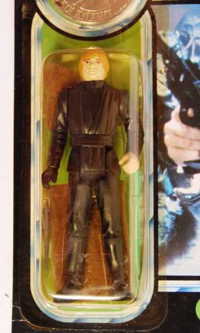 An original vintage 1984 Kenner made Star Wars carded MOC action figure ' Luke Skywalker ( Jedi Knight Outfit ) '. Factory sealed upon it's original unpunched 92 back The Power Of The Force card, with Collectors Coin. The bubble with no splits or dents, and blaster and saber still taped. Card generally near mint, with some veining and slight waving. Generally excellent.