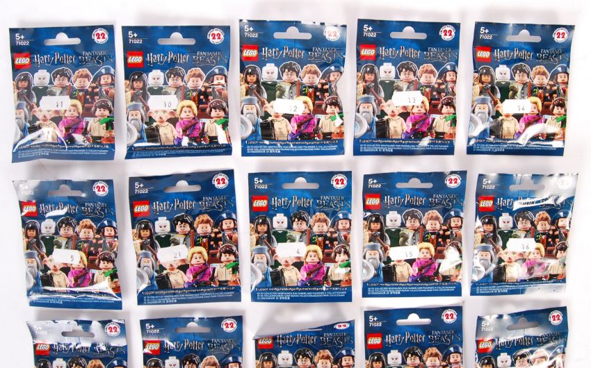 Lego Minifigures - a rare full set of Lego Harry Potter ' Fantastic Beasts ' series Minifigures. Each fully factory sealed, unopened with contents untouched. x22 total. ' Fantastic Beasts ' set comprising:1.  Harry Potter with Hedwig 2. Hermione Granger with Crookshanks 3. Ron Weasley with Scabbers 4. Draco Malfoy with Snitch5. Luna Lovegood 6. Neville Longbottom with Mandrake7. Cho Chang8. Dean Thomas 9. Lord Voldemort 10. Dobby 11. Professor Trelawney 12. Cedric Diggory  13. Professor Flitwick 14. Mad-Eye Moody 15. Harry Potter in Pajamas  16. Albus Dumbledore 17. Newt Scamander 18. Tina Goldstein 19. Jacob Kowalski 20. Queenie Goldstein  21. Credence Barebone 22. Percival Graves