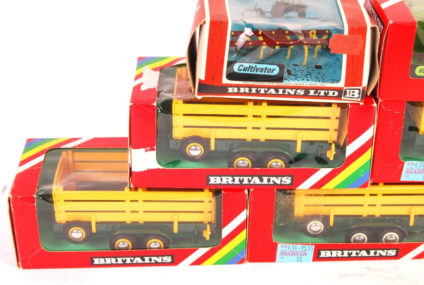 A collection of 7x original vintage 1980's Britains made 1/32 scale diecast models from the Farm Series comprising 5x 9555 Animal Farm Trailer, 9538 Vari Spreader and 9536 Cultivator. All models appear mint in good original boxed. Great collections.