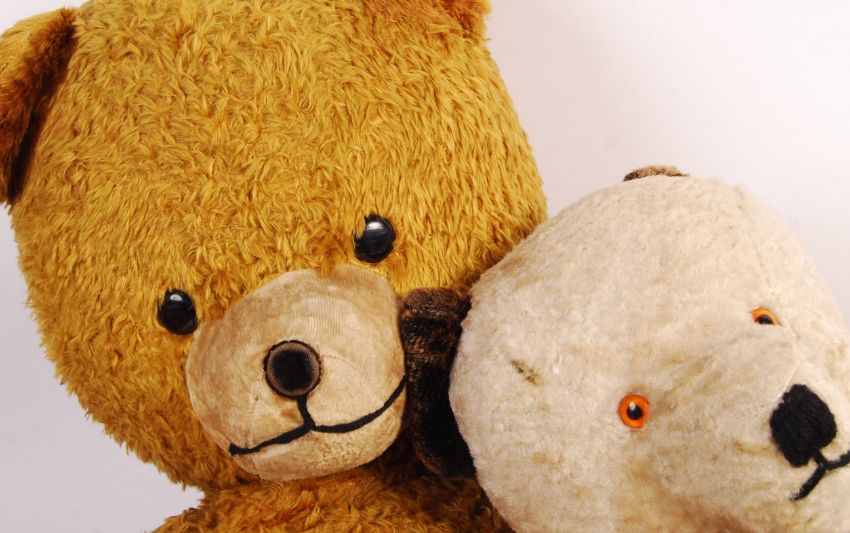 Two original vintage 1950's English large stuffed animal soft toy bears comprising a golden mohair bear with jointed head and libs and button eyes along with a panda having growler. Lovely examples.