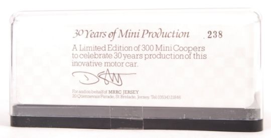 A rare MRRC Jersey made 1/32 scale slot car racing model 30 Years Of Mini Production. The gold plated / coloured model limited to 238/300 issues. Complete in original display case box with certificate. Great example.