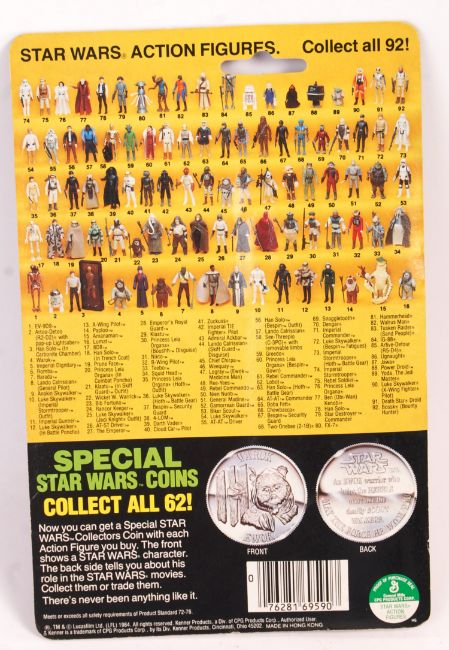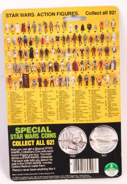 A rare vintage 1984 Kenner made Star Wars ' Last 17 ' MOC carded action figure of ' EV-9D9 '. On it's original ' Power Of The Force ' 92 back card with Collectors Coin. Bubble with some crushing and splitting to top, the figure unremoved and untouched. Card generally mint, some 'lumping' to the reverse around the bubble. Generally good to very good example. Rare.