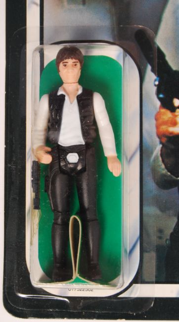 An original vintage Kenner made 1983 Star Wars carded MOC action figure ' Han Solo '. Factory sealed upon it's original 65 back Return Of The Jedi card. Fully factory sealed, with weapon still taped in place. Bubble with no splits or dents, card very flat and mint (very light veining to reverse). One of the best examples of this figure we have ever seen. Rare.
