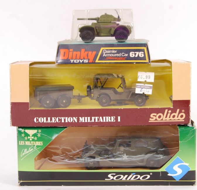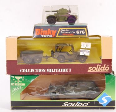 A collection of approx 20 assorted military related diecast models to include boxed Dinky 676 Daimler Armoured Car, 689 Medium Artillery Tractor, 621 3 Ton Army Wagon, boxed Solido 6006 Packard HQ, 6034 Jeep Remorque, planes and many more models. All models in fair - good condition some repainted. Great collection.