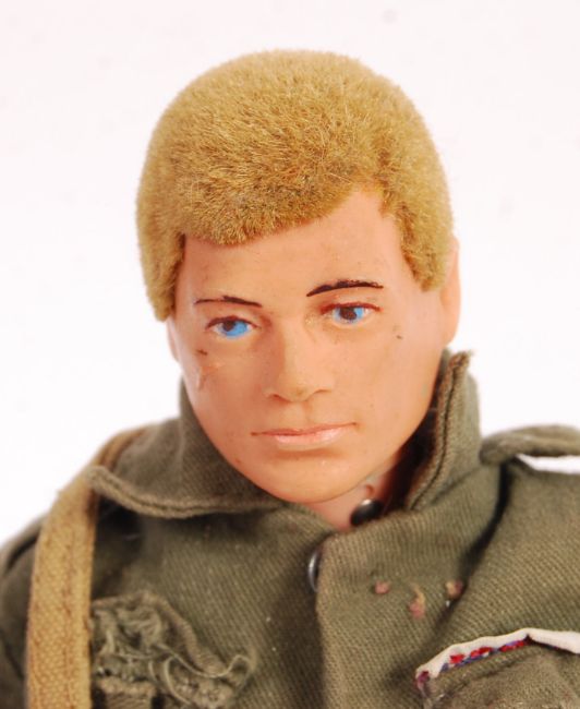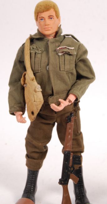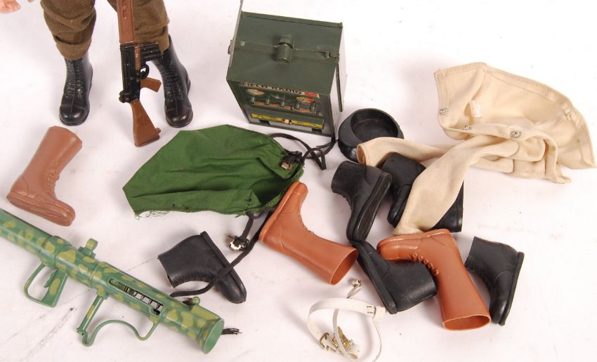 An original vintage Palitoy made Action Man figure - with blonde flocked hair and plastic hands, dressed in uniform, along with some unboxed accessories - wireless set, boots, rifle etc.