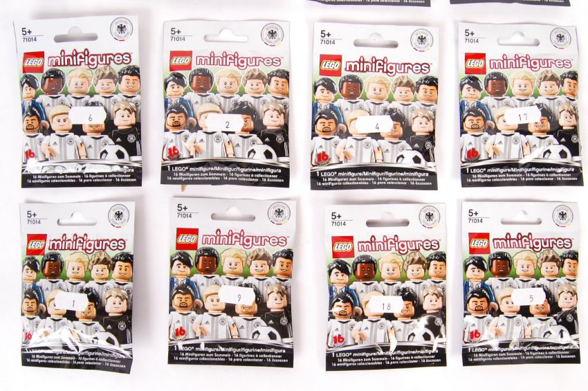 Lego Minifigures - a rare full set of Lego DFB German Football Team series Minifigures. Each fully factory sealed, unopened with contents untouched. x16 total. Features the figures of: Joachim Löw, the goalkeeper Manuel Neuer, the defenders Jérôme Boateng, Mats Hummels, Benedikt Höwedes and Shkodran Mustafi, the midfielders Bastian Schweinsteiger (captain), Mesut Özil, Thomas Müller, Toni Kroos, Sami Khedira, André Schürrle, Marco Reus, Christoph Kramer and the strikers Mario Götze and Max Kruse. Rare Lego figure set.