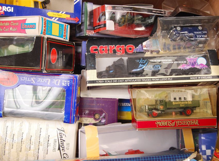A large collection of 40+ boxed diecast models to include: Atlas, Matchbox, Britains, Burago, Lledo, Models of Yesteryear, Corgi, Oxford, EFE and many more. All models appearing mint in original boxes. Great collection.