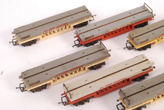 A collection of x10 original vintage Tri-ang / Triang Minic Motorways vehicles - all unboxed - and all 00 gauge railway trainset loaders / wagons. Various colours and variations.