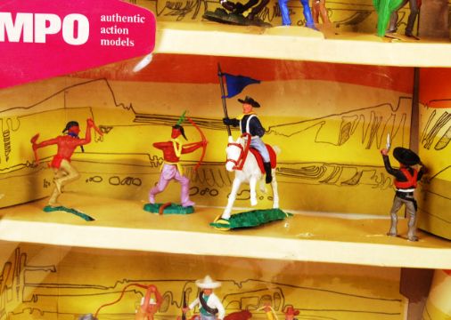 An incredibly rare original vintage Timpo Toys plastic model Western figure triple-set ' Cowboys & Indians '. Contents appear mint and unused - still banded upon the original bases. Original display box present. A rare and seldom-seen set of Timpo figures.