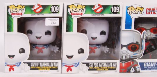 A set of four Funko pop made vinyl action figures to include; 2x 109 Ghostbusters Stay Puft Marshmallow Man and 2x 135 Captain America Civil War Giant-Man. All appear mint within their original boxes.