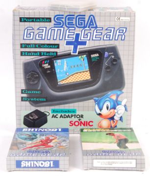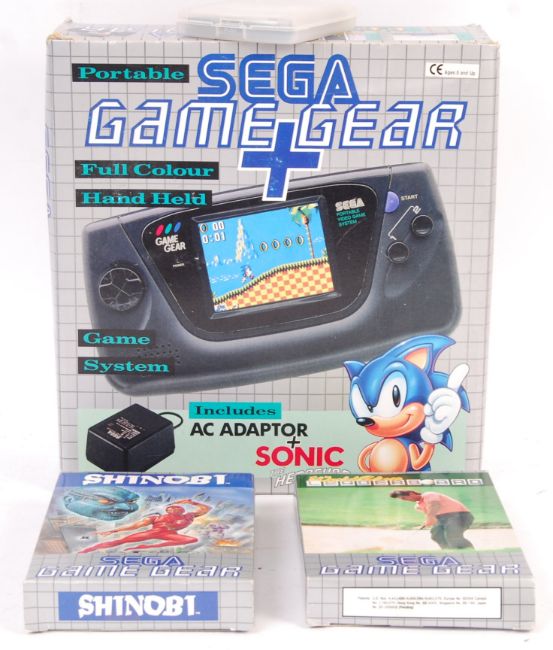 A vintage Sega Game Gear handheld portable video games computer console complete in box with A/C adaptor, console and Sonic game cartridge along with 2x boxed games to include; Shinobi and World Class Leaderboard.