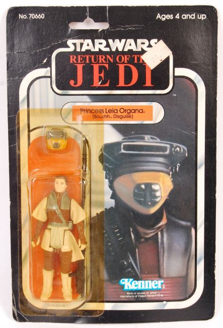 An original vintage Kenner made Star Wars MOC carded action figure ' Princess Leia Boushh Disguise '. Original 77 back Return Of The Jedi card. Figure fully factory sealed, mint and untouched. Bubble slightly yellow, with some crushing towards the top. Card back generally good, some veining to top. Rare.