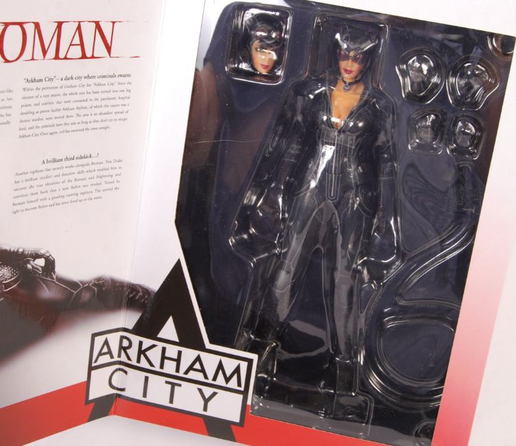 A set of x3 Play Arts / Playarts made ' Batman - Arkham City ' scale action figures. Comprising: No.1 Batman, No.2 Catwoman, and No.3 Robin. All appear mint, unused and as new, within their original presentation boxes. Highly detailed figures.
