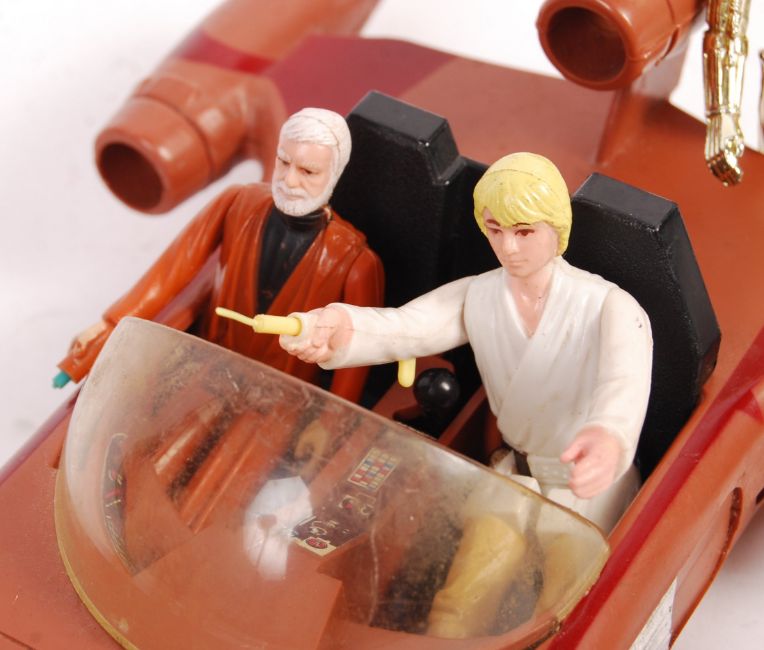 An original vintage Palitoy made Star Wars ' Landspeeder ' action figure playset. Palitoy variant with fixed bonnet. Unboxed, wheel lever in working order. Along with the related ' First 12 ' issue action figures - Luke Skywalker, Obi-Wan Kenobi, R2D2, C3PO and x3 Sand People / Tusken Raiders. All with the relevant original weapons. All from a genuine childhood collection. Wonderful display set.