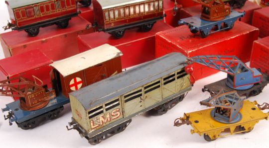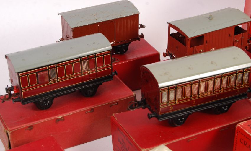 A collection of assorted boxed 0 Gauge model railway locomotive trainset coaches, buffers and cranes; 42123 No.51 Coach BR British Railways, Coach BR British Railways, RS655 Brake Van, 42160 No.1 Goods Van LMS London Midland Scotland, 42170 Good Brake Van BR British Railways, 42201 No.41 Passenger Brake Van LMS, R155 No.1 Passenger Coach LMS, 42330 Platform Crane, Crane Truck, A822 Platform Crane, A801 No.1 Buffer Stops ( Spring ), No.1 Buffer Stop ( Spring Type ), 42300 No.1 Buffer Stop ( Spring Type ) along with 4x loose crane truck and a hydraulic buffer stop.