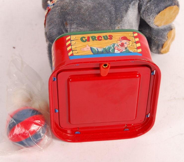 A charming original vintage Rosko Steele ' Made In Japan ' tinplate battery operated ' Circus Elephant With Blowing Ball & Parasol ' No. 821. Appears in very good condition, very likely unused, within the original box. Both small balls and large beach ball present, as well as the parasol. Box retains the inner card slip. A charming vintage battery toy.