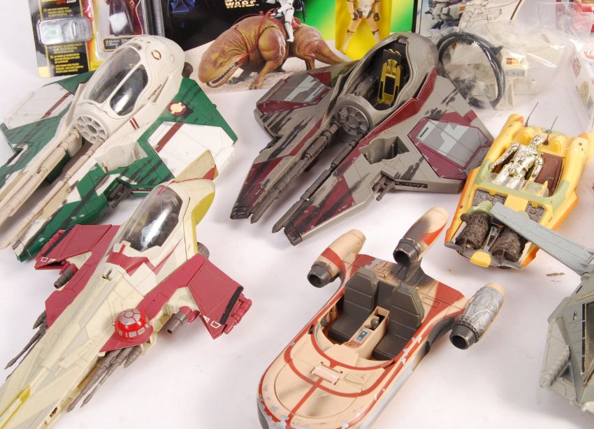 A collection of assorted Star Wars action figure playset vehicles, figures and Lego to include two Lego sets,6x unboxed ships, carded figure, Dewback toy, original vintage Kenner Minirig etc. Good collection.