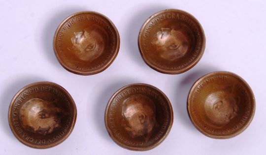 An charming set of five original WWI First World War British Military trench art miniature Brodie helmets constructed from five pennies - one for each year of the Great War. Each measures approx: 2.5cm.