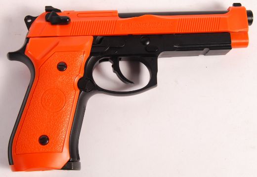 A contemporary 2003 Air Model Firearms M190 Special Forces 6mm handgun. Orange and black plastic construction with some metal parts. Complete in case. Gun measures: 21cm.
