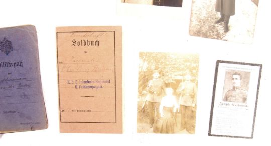 An interesting collection of WWI First World War German related ephemera. Includes several ' Feldpost ' letters, most with original envelopes, several Memorial or ' Death ' cards, a soldier's ' Militarpak ' book, a real photographic postcard showing soldier's celebrating Christmas, and a soldier's ' Soldbuch ', various real photograph postcards of German soldiers in uniform, a photograph of German Prisoners Of War,  and other items. All unrelated.