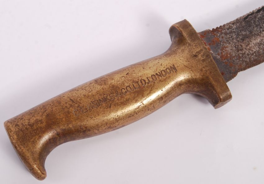 A 19th / 20th Century standard pattern C E Heinke & Co LTD London brass and steel divers knife having a solid brass handle with hooked pommel, straight knuckle guard, stamped grip, steel single edged and serrated edge blade. Measures; 28cm overall.