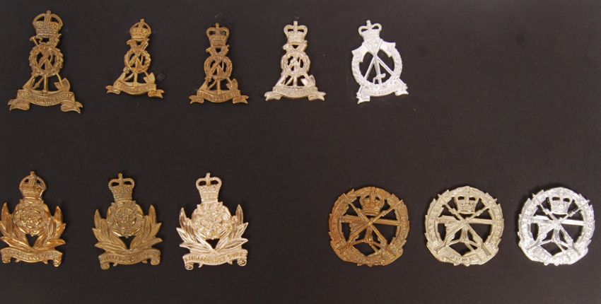 A good collection of 40+ assorted WWI First World War and later British Army military issue uniform cap badges. Largely metal, with one or two plastic examples present. Each neatly mounted to a display board. Includes: Military Police (including George V, VI and ERII examples), Royal Army Medical Corps, Royal Army Veterinary Corps, Royal Army Dental Corps, Small Arms School and others. Great collection, with some interesting badges present. Note: from an incredible large private collection of military cap badges - the majority of which are genuine period examples. Some restrikes and replicas will be present, and buyers are reminded to satisfy themselves as to individual lots prior to bidding, irrespective of description.